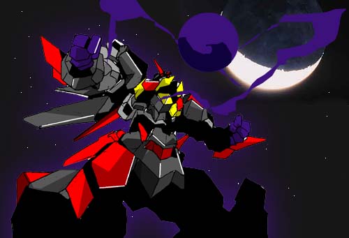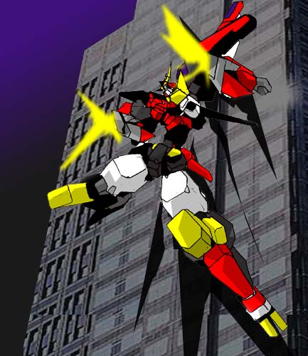 地面に叩き落とされるドラグカイザーに追い討ちをかける魔甲鬼神、それをブレイザーで迎撃するドラグカイザー しかし魔甲鬼神は両肩のパーツ鋏状に変えて撃ち出して来る、流石のドラグカイザーもこのタイミングをかわす事が出来ずに両腕の自由を奪われビルに貼り付けられてしまう、 |